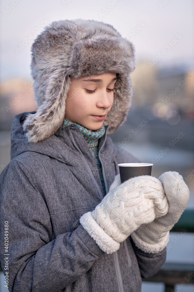 portrait of a boy with a cup of hot drink in his hands, steam over hot tea, takeaway coffee, hands in mittens, keep warm with a hot drink in winter