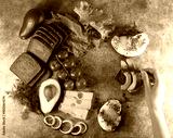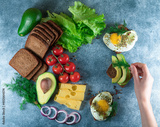 avocado, egg sandwiches on whole grain bread with tri-colored tomatoes on rustic baking tray