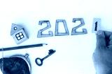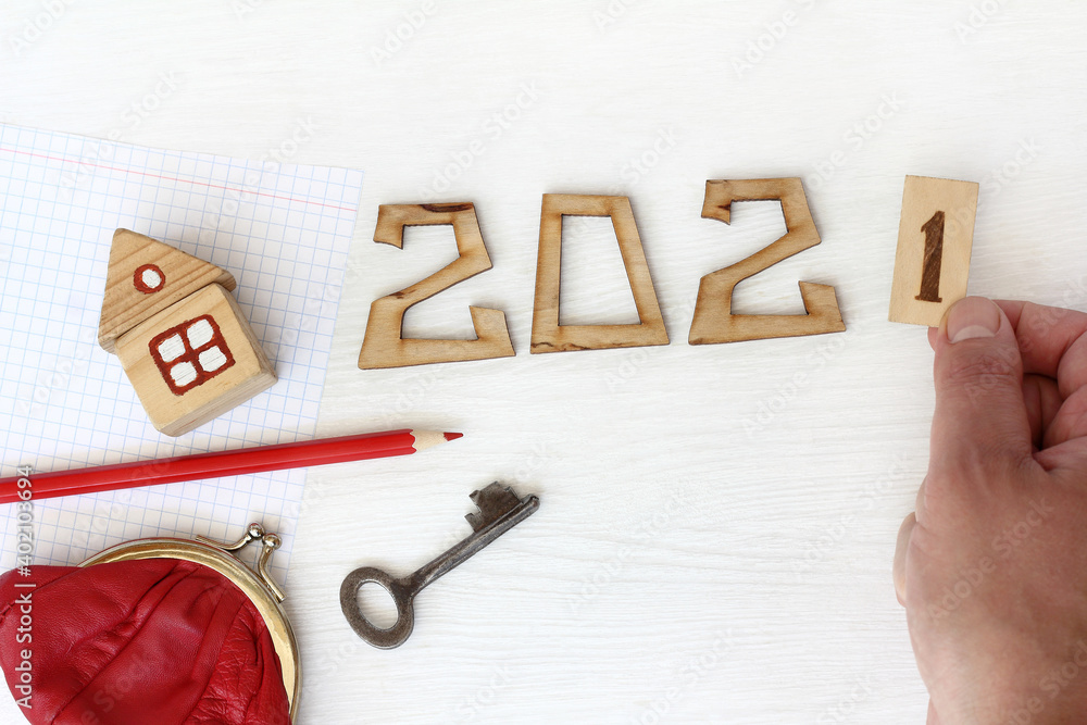 the hand adds the number one to the objects on the table, including the house, wallet and key. plan for buying real estate in 2021