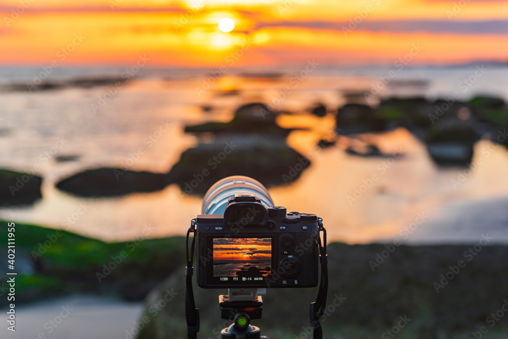 Camera on tripod captures colorful sunrise