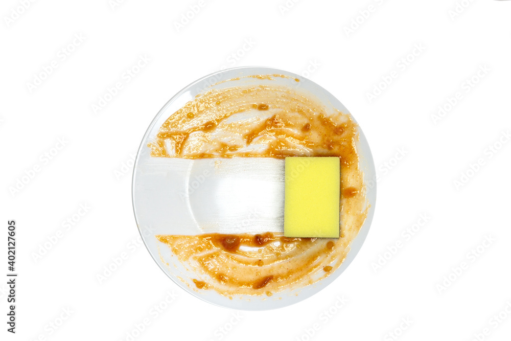 White round dirty plate with red sauce, yellow foam sponge cleaning dish top view , isolated on white background. Health and cleaning business concept