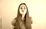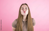 Close-up portrait of attractive cute girl thinking looking at camera with pouting lips isolated on pink colored background with copyspace