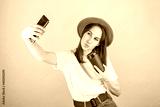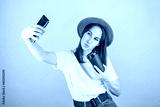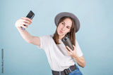 Smiling adorable caucasian female making selfie photo on smartphone with positive expression in casual clothing and coffee in gands over blue background.