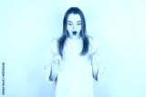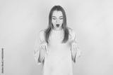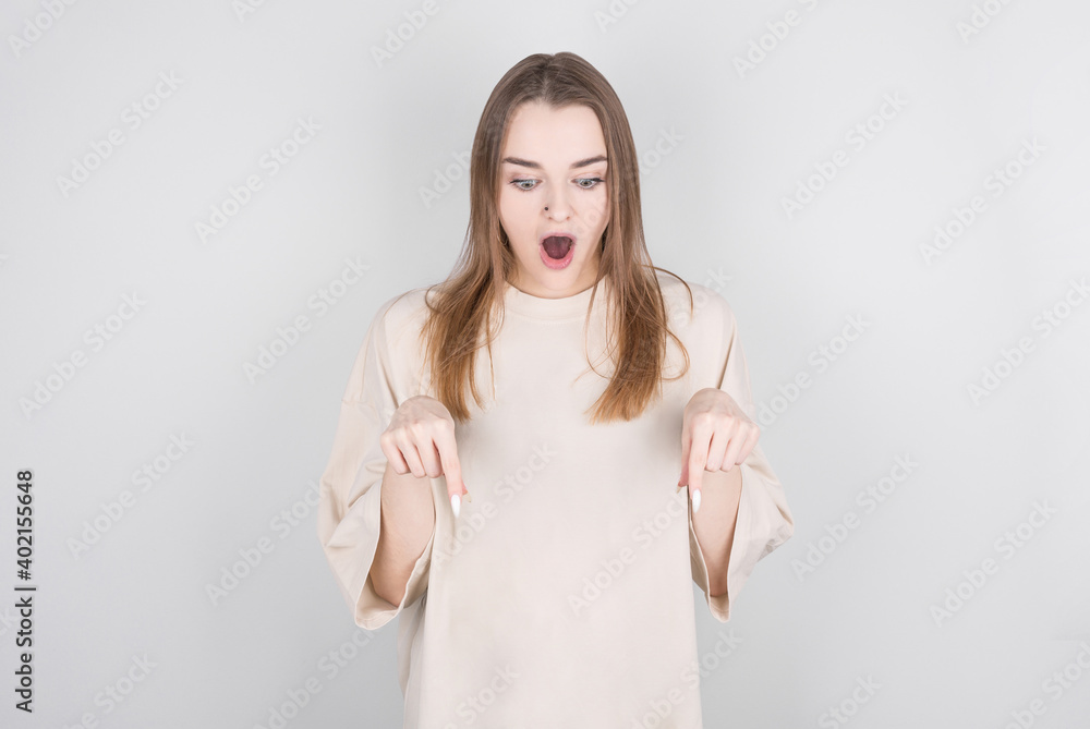Photo of surprised brunette woman points on floor, has shocked facial expression, wears white t shirt against white background. Wow concept.