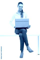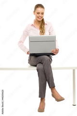 Woman sitting on table with laptop