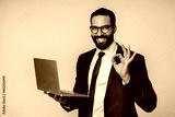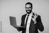 Successful young islamic businessman showing okay gesture with laptop isolated over grey background