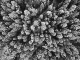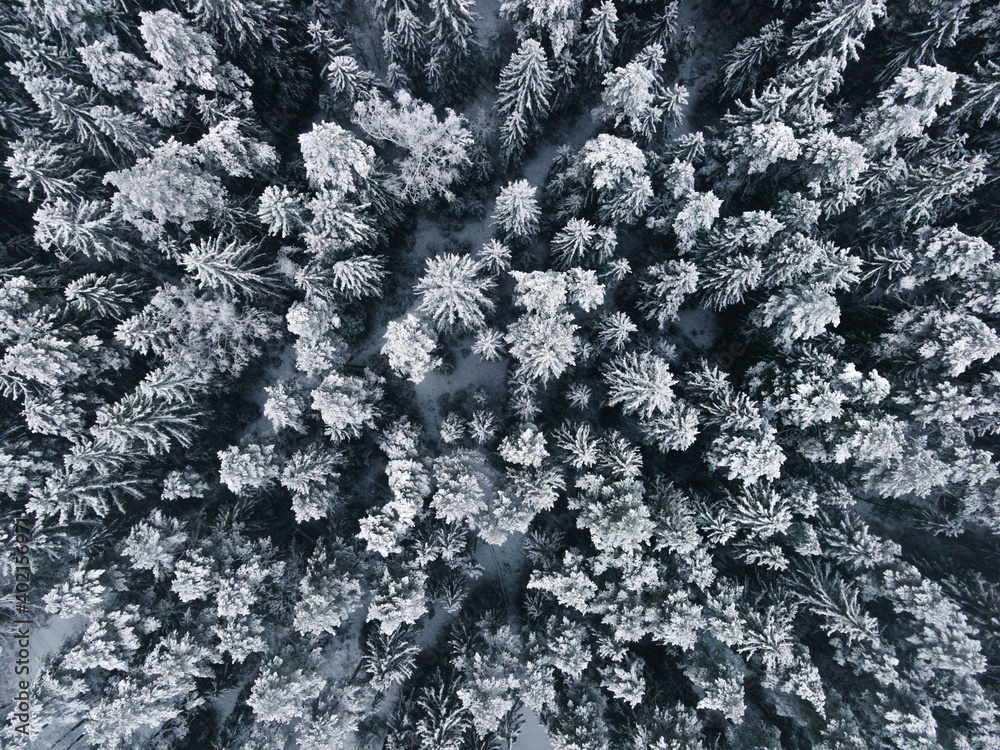 Winter Forest aerial view. Snow covered Winter landscape. Spruce forest European Green Deal. Top down birds eye view. Climate neutral global warming. Latvia landscape. Winter background.