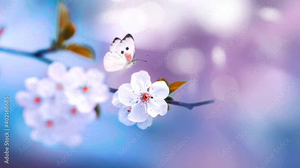 Beautiful white butterfly in flight and flowers with soft focus. Branch blossoming cherry in spring on blue and lilac background, macro. Amazing elegant artistic image beauty spring nature.