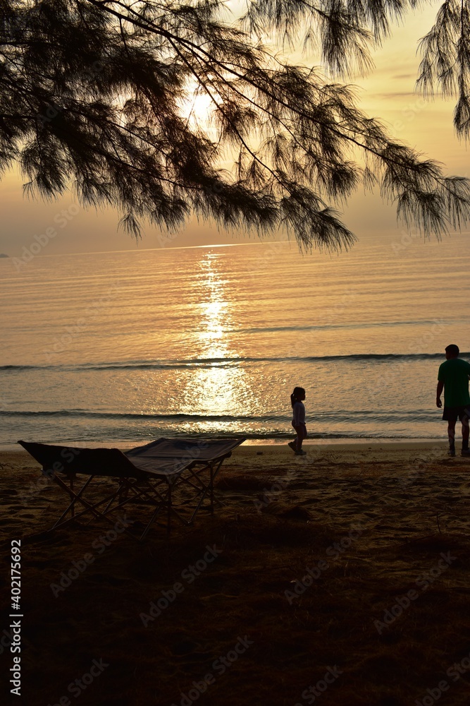 The rising sun view and the beach. Beautiful golden yellow sky and sun The view of the beach, the beach and the sun loungers are rising. Beautiful golden yellow sky and sun