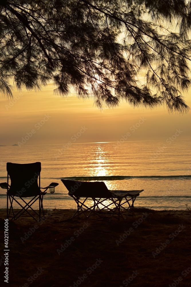 The rising sun view and the beach. Beautiful golden yellow sky and sun The view of the beach, the beach and the sun loungers are rising. Beautiful golden yellow sky and sun