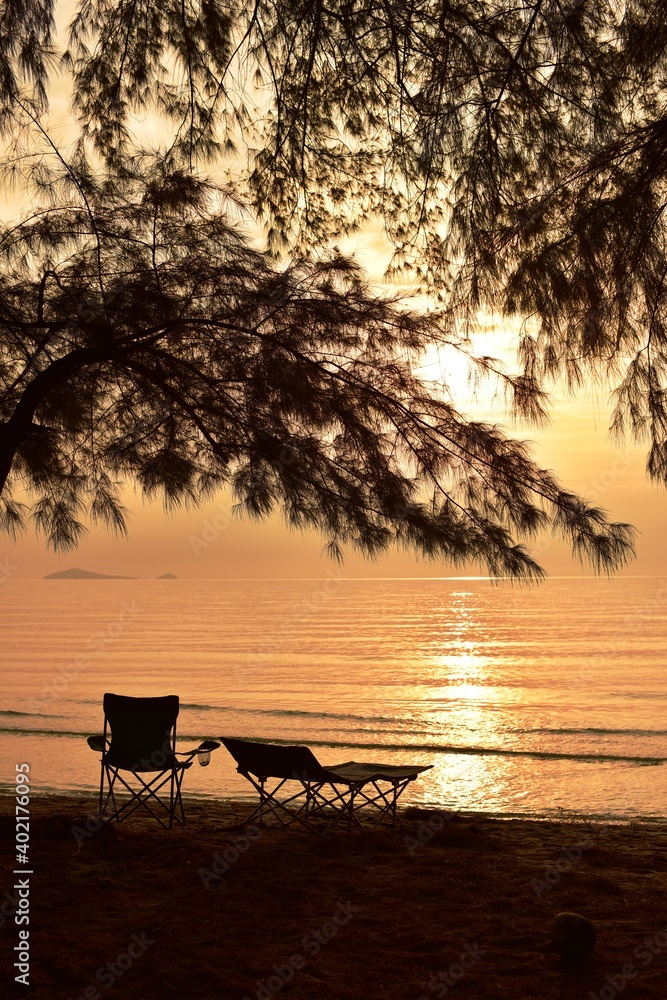 The rising sun view and the beach. Beautiful golden yellow sky and sun The view of the beach, the beach and the sun loungers are rising. Beautiful golden yellow sky and sun