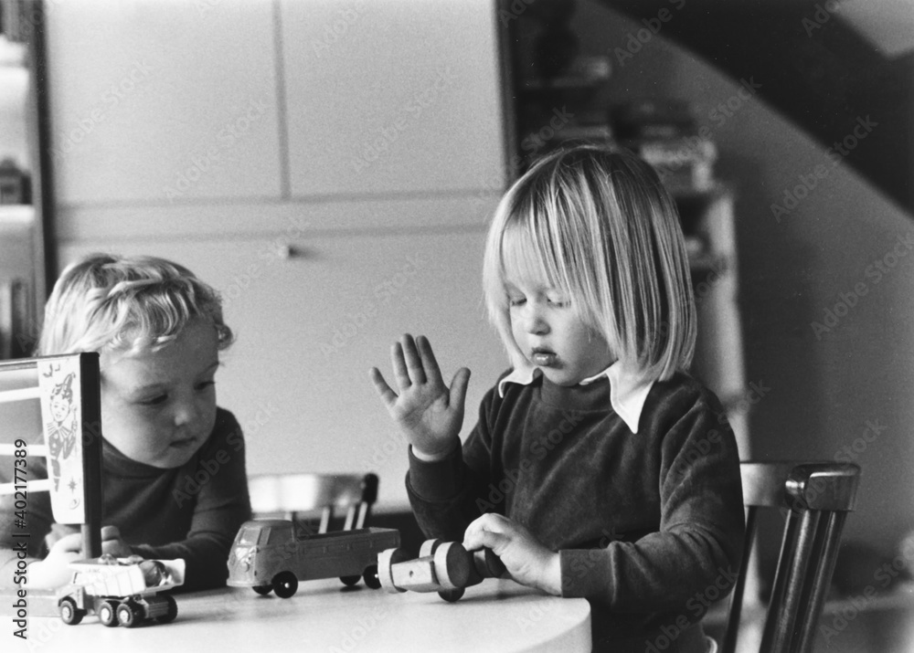 1977 vintage, seventies, retro monochrome image of young boy and girl playing with toy cars at a dining table in a seventies living room.