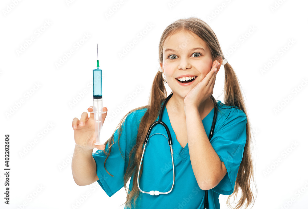 Positive kid wearing surgery uniform and surprise on her face, holding a syringe with vaccine, isolated on white background. Girl playing in medical profession