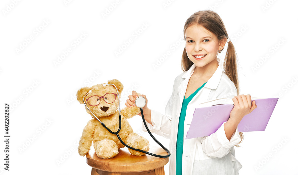 Smiling girl wearing in a medical coat with a book in her hand playing doctor and listening to her patient plush bear using phonendoscope