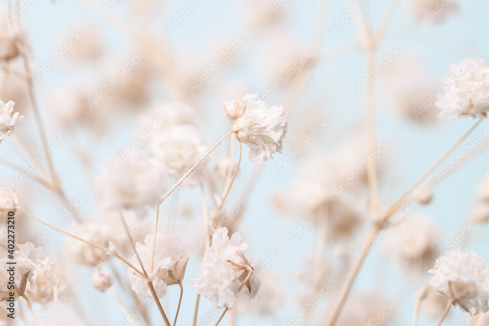 Gypsophila delicate romantic dry little white flowers bouquet on light blue bokeh natural background macro