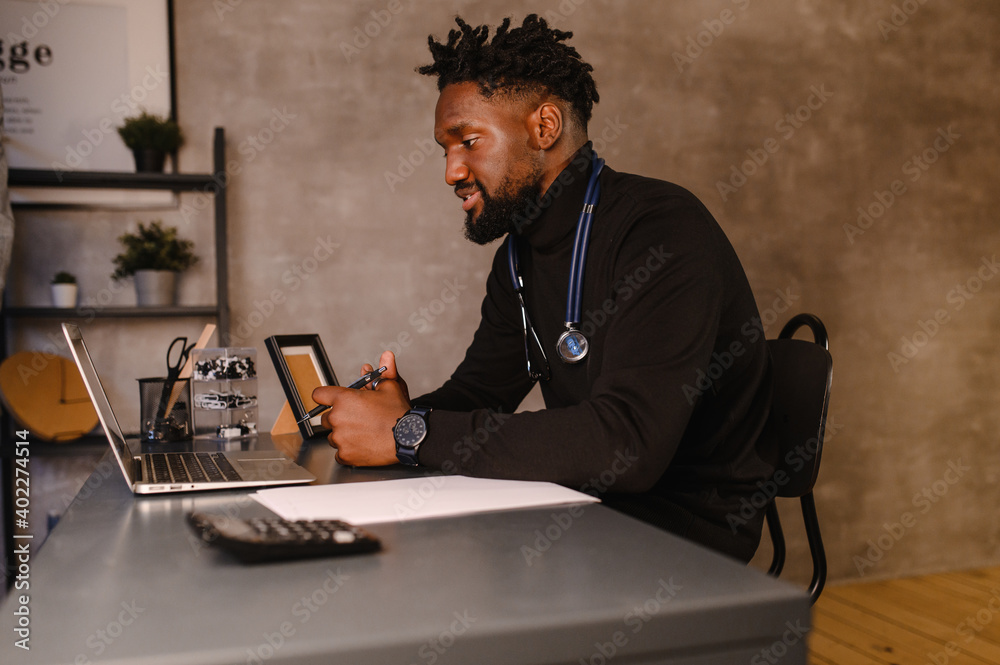 telehealth with virtual doctor appointment and online therapy session. Black doctor online conference