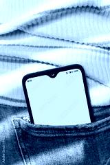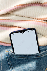 Close up Mobile phone with blank screen, in a jeans pocket. Focus on screen.