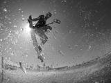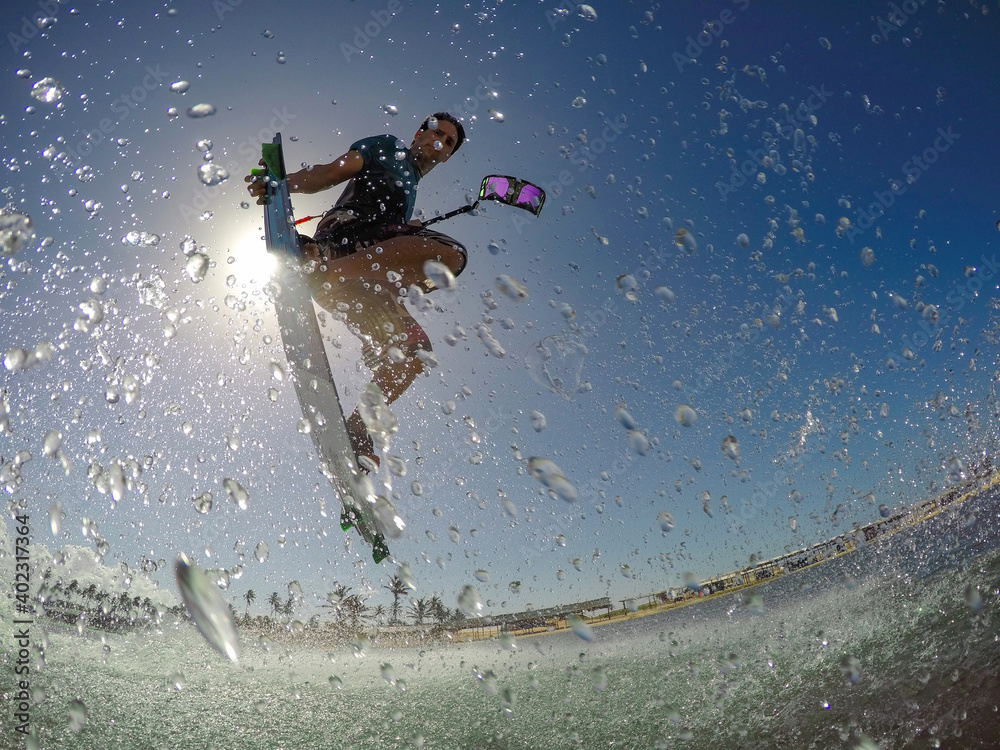 LOW ANGLE: Athletic young man splashes water at the camera while kitesurfing.