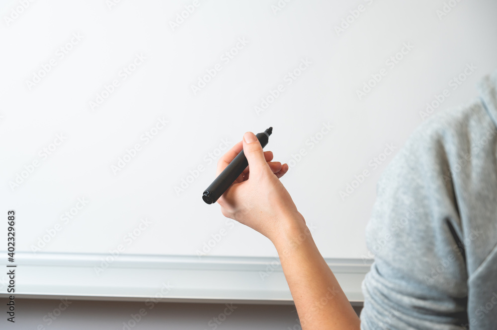 Office and business concept, hand-holding or writing with black marker on the whiteboard or backdrop.