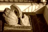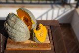 View from above on a huge pumpkin at a balcony lying on a wooden board. One bright orange slice has been cut out and standing in front of the vegetable. Sun is fallen on the seeds of the small piece
