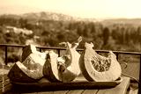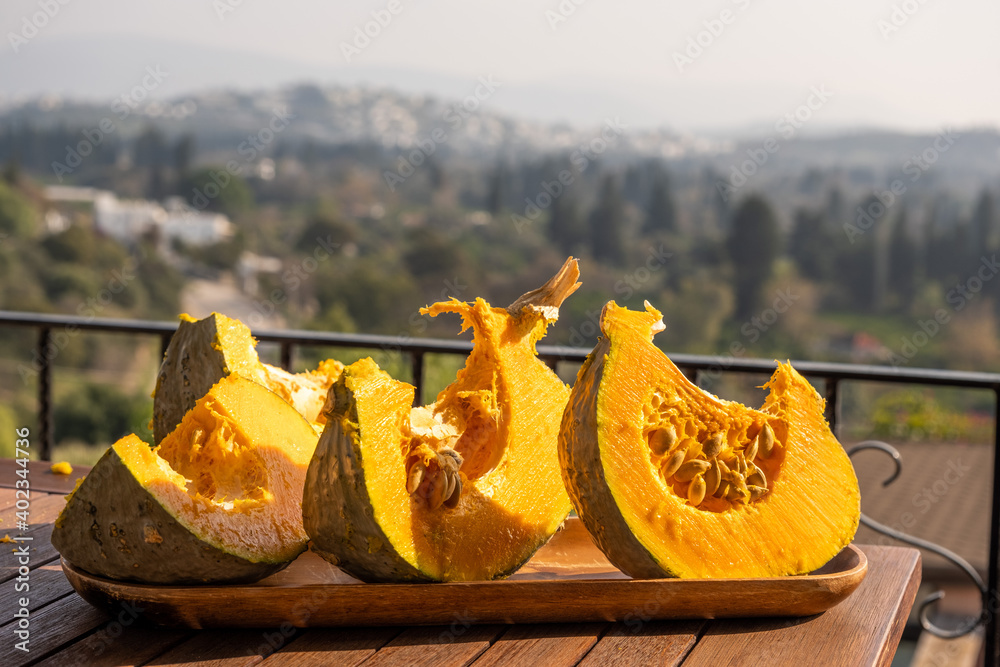 Side view of four slices of a freshly cut pumpkin. Raw vegetable inner and seeds are visible. Fruits are in line standing against green valley in a wooden plate. food background with copy space