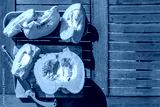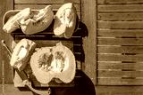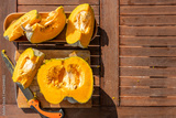 Top view of a fresh sliced pumpkin on a wooden table under sun light. The fruit was recently cut with a saw. Raw inside and seeds of vegetable are visible. Food background with copy space