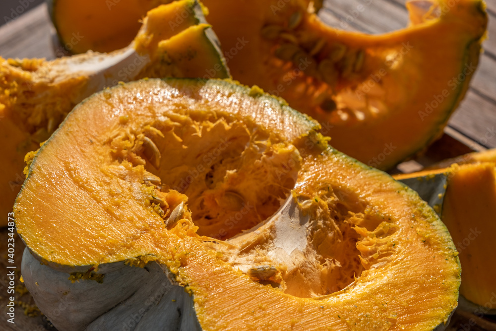 Close up and top view of a fresh sliced pumpkin on a wooden table under sun light. Blur background while focus is on the cutting area. Food photography with copy space
