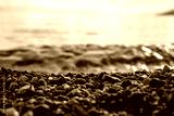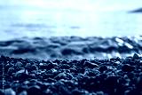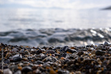 Focus on the middle of many shiny wet and colorful pebbles next to the shore. In background waves and horizon. Sky reflects in water