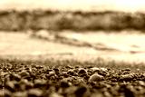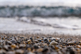 Focus on the middle of many shiny wet and colorful pebbles next to the shore. Blur nature background