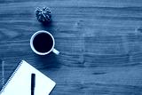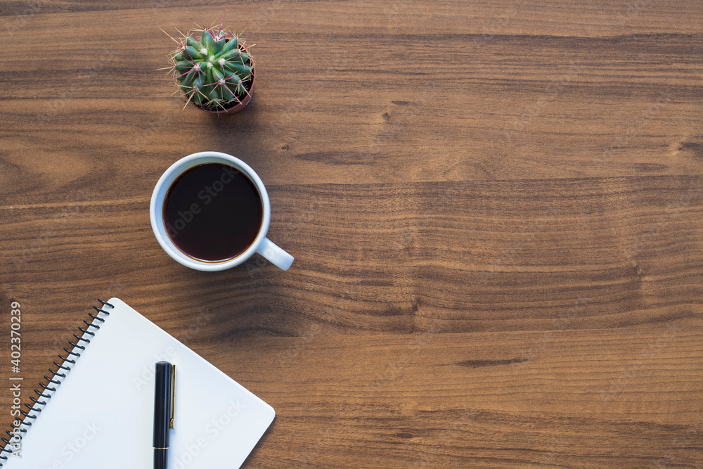 Workplace. Notebook and coffee cup on a wood office desk, copy space