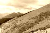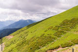 Green mountain scenery with vivid green mountainside. Coniferous trees and rocks on big hillside. Scenic alpine landscape. Big stones on steep slope with rich vegetations