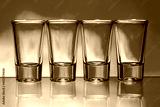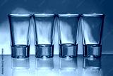 Glass vodka shots. Alcohol drinks in a row texture. Weekend party background. Reflective bar surface. Backlight transparent glass backdrop.