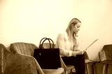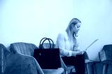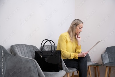 Blond woman in a yellow blouse waiting for an interview for a job. Prepares by reading information about the company.