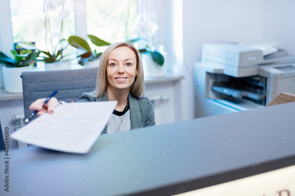 A nice, smiling blond woman at the reception desk, office, notary office gives the documents.