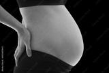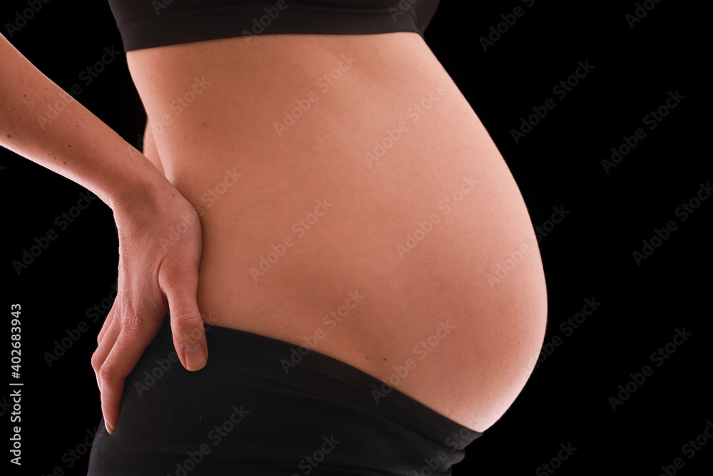close up view of pregnant belly. Woman in black underwear isolated on black background.