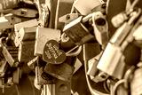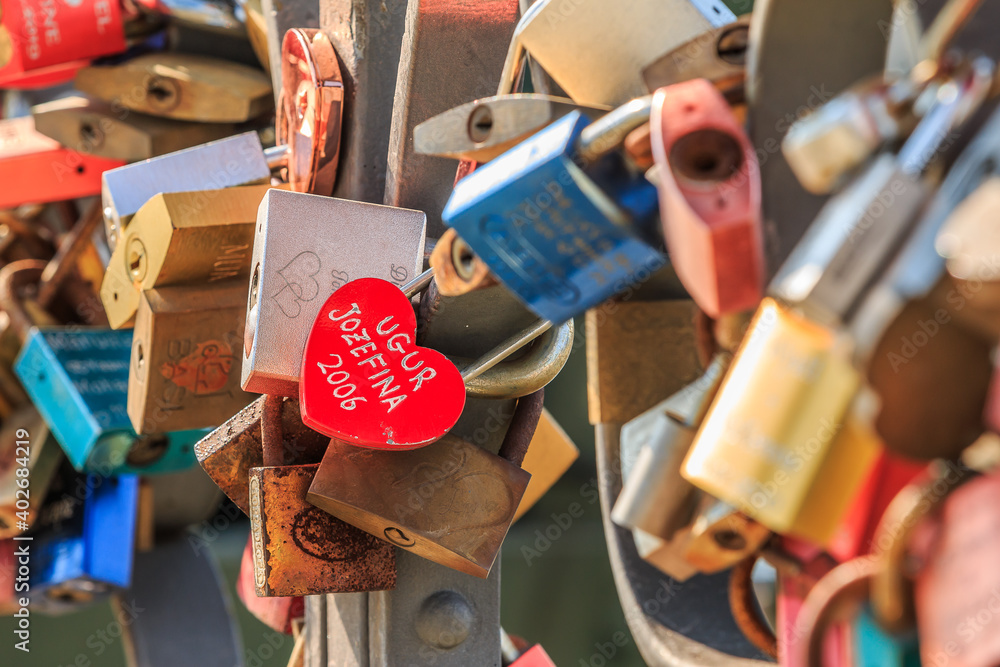 Detail of the bridge railing in Frankfurt with locks of love. Heart-shaped lock in the foreground. colorful locks with lettering on a sunny day in spring