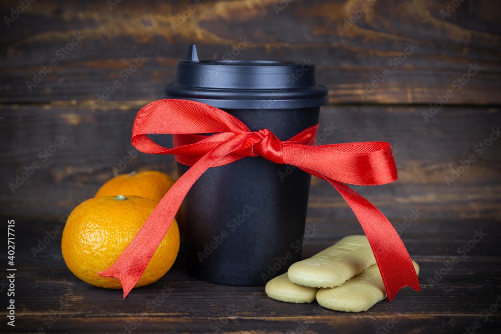 Black paper disposable takeout drink cup with bow of satin red ribbon, tangerines and cookies near on wooden boards background. Coffee or tea as a gift