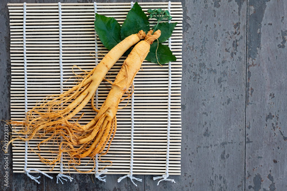 Fresh ginseng root on bamboo basket with green leaves and berries