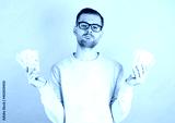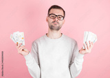 Portrait of happy young businessman holding money bills isolated on pink background