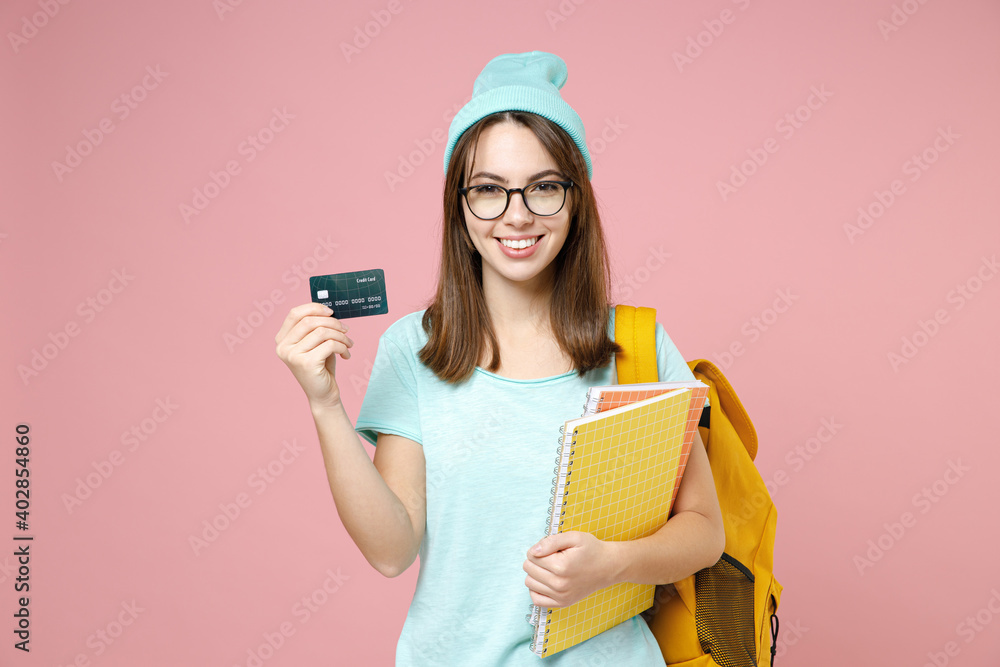 Smiling young woman student in casual blue t-shirt hat glasses backpack hold notebooks credit bank card isolated on pastel pink color background. Education in high school university college concept.