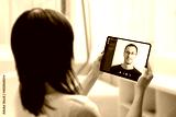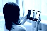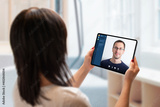 Video call on tablet concept. Work at home in virus epidemic. Woman holds a tablet and talks to a colleague.