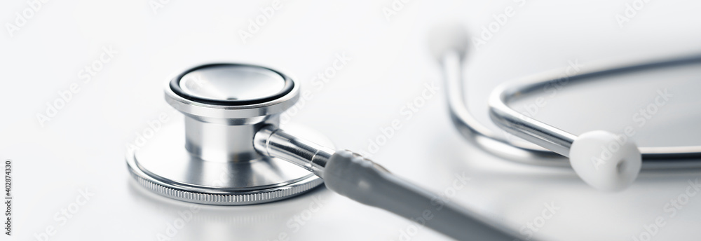 Medical or healthcare concept banner. stethoscope on on a gray desk. Doctor appointment or checkups schedule. Copy space. Banner