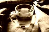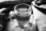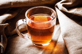 Black tea in transparent glass. Golden color tea. Brown hot beverage. Tea mug on linen fabric. Morning hot drink on vintage canvas.