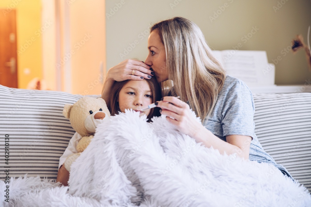 A caring mother kisses her sick daughter on the forehead. Checking the temperature.