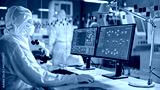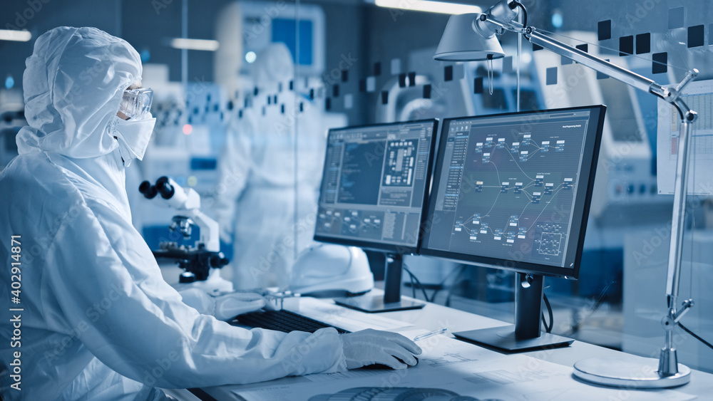 Electronics Factory Cleanroom: Engineer / Scientist in Coveralls Works on Computer, Screen Shows Infographics and Software System Control UI, Developing Electronics for Medical Electronics