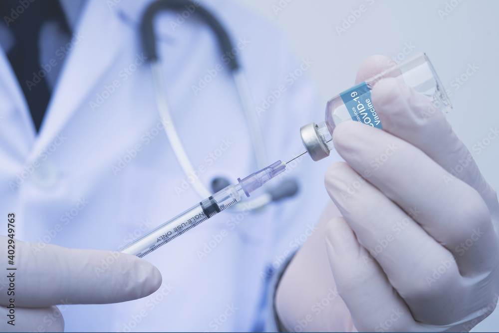 Covid-19 Coronavirus vaacination, doctor holding syringe drawing COVID 19 vaccine from drug vial in hospital