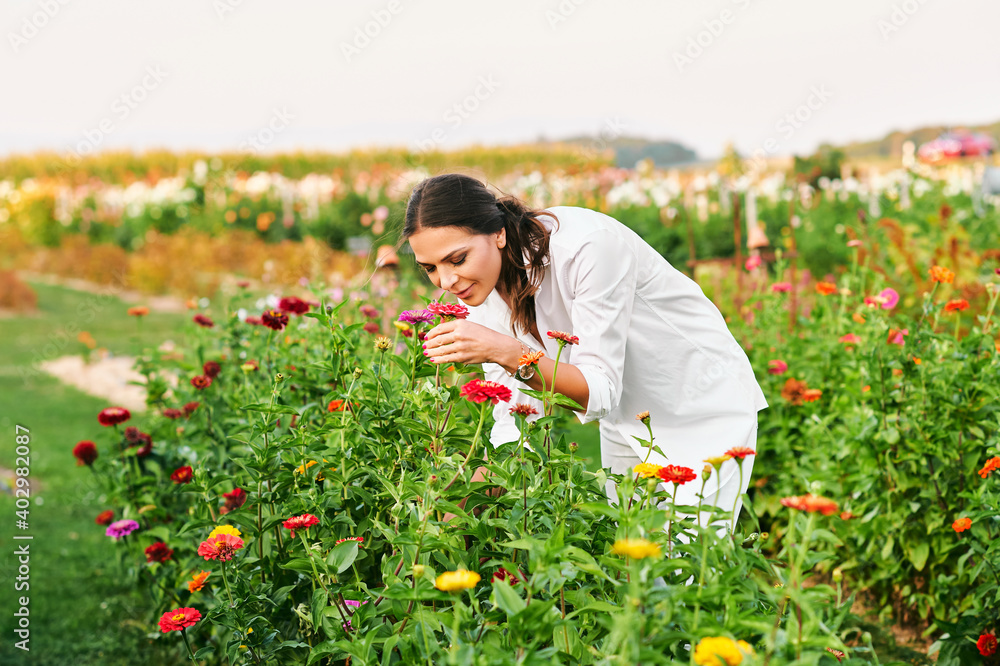 Outdoor portrait of beautiful woman cutting flowers, flower farm, nature lifestyle