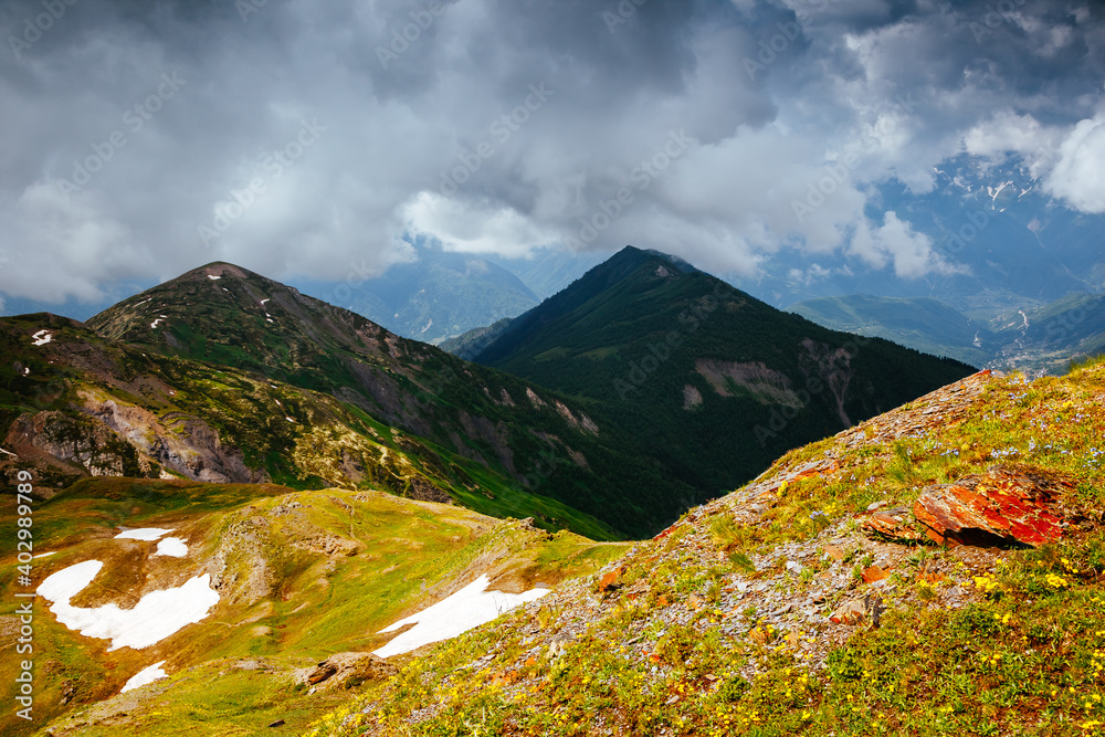 Splendid summer view of alpine landscape at the foot of Mt. Ushba.