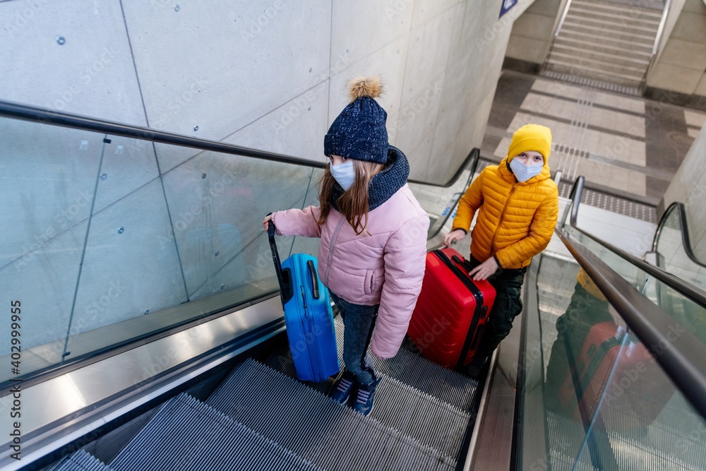 Children wearing protective masks with suitcases go up the escalator to the train station platform.