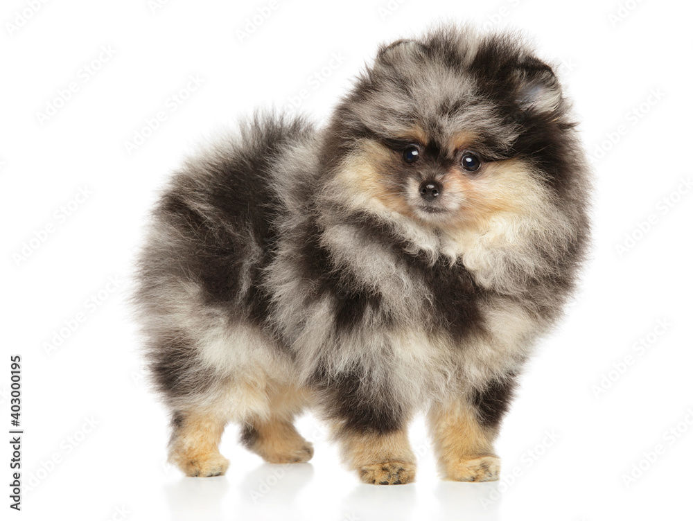 Pomeranian puppy of marble color, standing on a white background